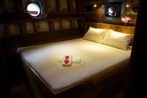 There are 5 luxury cabins to choose from spread over the 3 decks: 2 double bed cabins and 3 cabins each with 2 single beds all with en-suite shower room Air Conditioning and hot water.