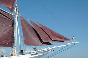 Registry: Indonesia LOA: 33 meters LOD: 28 meters Beam: 8,5 meters Draught: 3,5 meters Engine: 10 cyl. Mercedes Benz OM 403 Rig: Gaff rigged ketch - 600m2 of sails Cruising speed: 8 knots Top speed: 10 knots (under engine and sail) Cabins: 6 air conditioned, with private en-suite heads Water tanks: 6000 liters Water maker: 4 tons per day Fuel tanks: 9,000 liters Auxiliary Power 49 KVA generator MWN 59 KVA generator Mitsubishi MWM 24 volts emergency supply Solar panels and Wind turbines Navigation Furuno Radar (range 24 NM) Depth sounder, GPS VHF and SSB Radio Satellite phone Safety 2 Life rafts (20/25 pax) Flares 36 life jackets EPIRB beacon Tenders 2 Outboards 15 HP Yamaha & 50 HP Tohatsu |