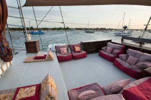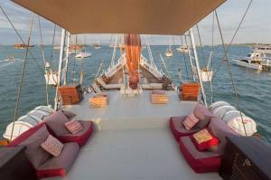 Katharina is a mix of traditional and modern design. Her hull and rigging are traditional, while the deck house and interior were custom designed to adapt to Western tastes of space, privacy and comfort. While Indonesian traditional sailing vessels are customarily referred to as Bugi Schooners, strictly speaking Katharina is rigged as a Ketch, the foremast being higher than the aft mast. We know from experience that during a cruise in the tropics some of our guests discover the pleasure of sleeping under the stars and there is plenty of room to sleep on the upper deck. Mattresses as well as light blankets are available for that purpose.
